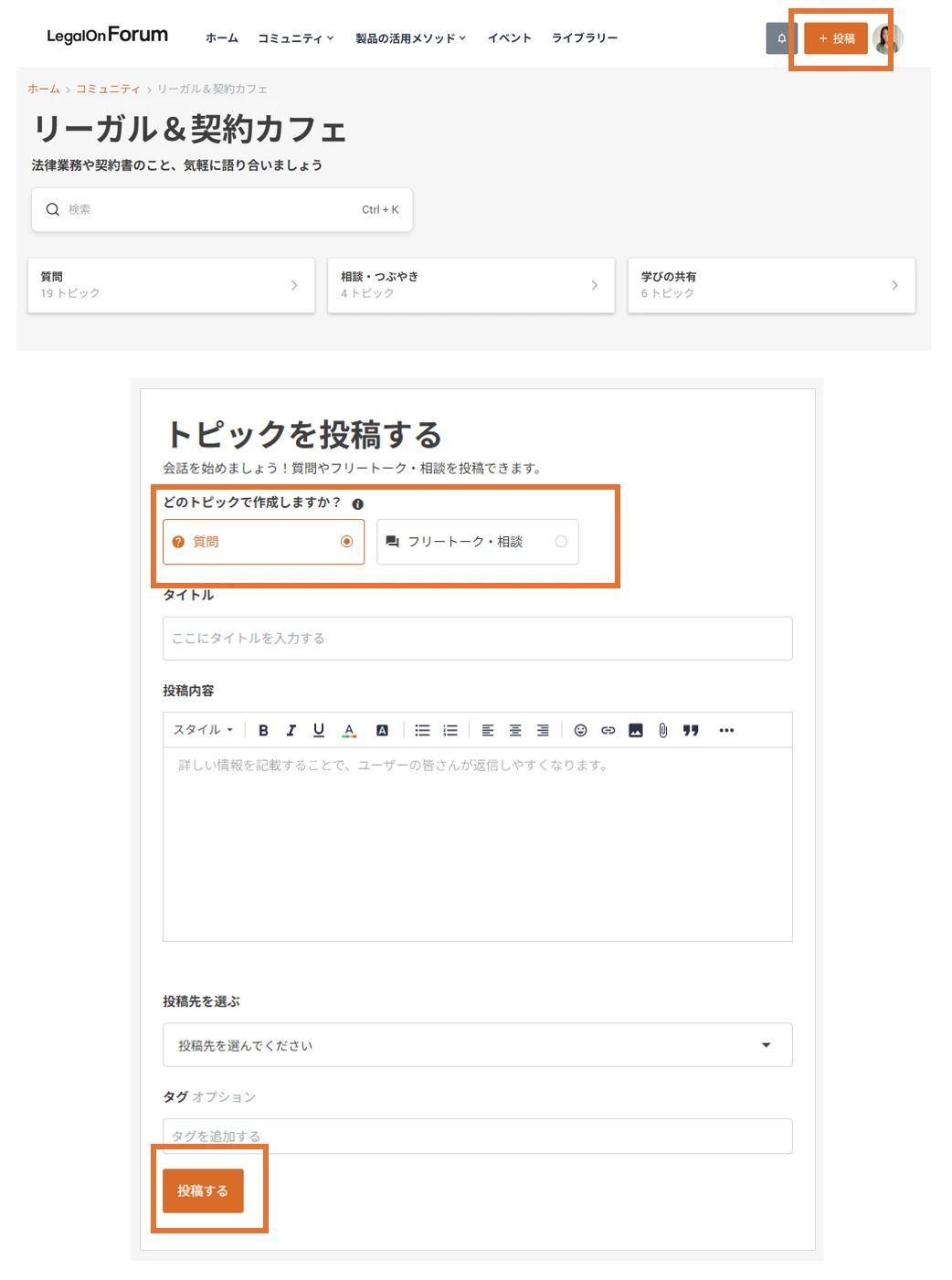 疑問や質問を投稿したい時は「質問」を、気軽に意見を募りたい時や話題を上げたい時は「フリートーク・相談」を選択し、必要事項を入力してください。