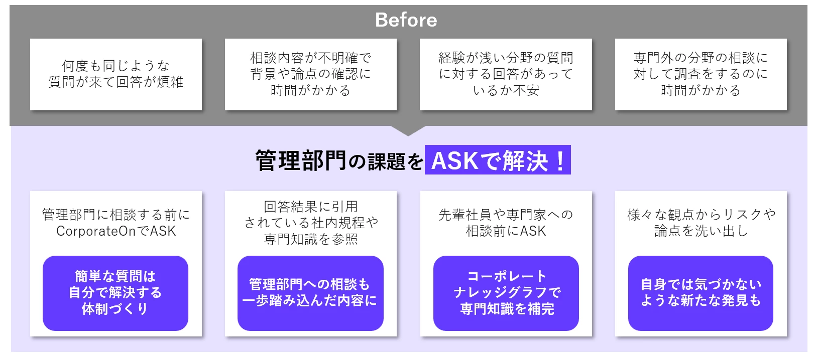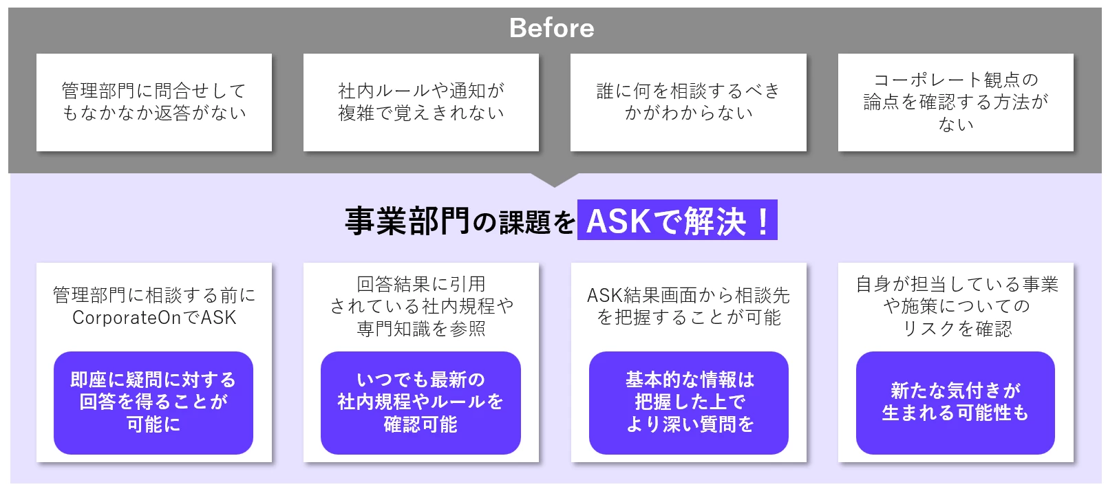事業部門から日々大量に寄せられる相談への対応や頻繁に変わるルール、規制への対応などに多くの時間を割いている中、問い合わせへの一次回答や専門知識の情報収集をCorporateOnがサポートします。