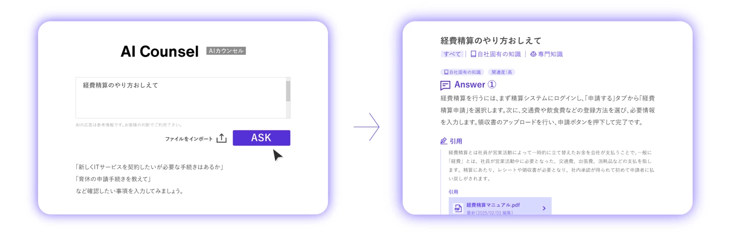 ASK機能(=回答機能)は、聞きたいことを入力するだけで、その問に対する回答を即座に得ることができます。回答を導くために参照した情報も確認できるので「その情報が本当に正しいのか」を確認することもできます。